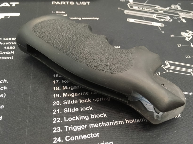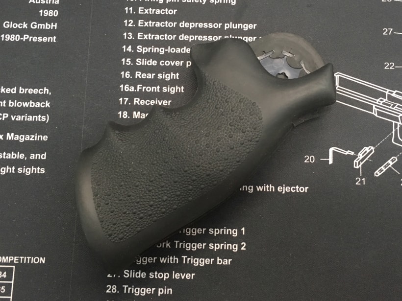 ホーグの実銃用ラバーグリップ。ワンピース構造で、専用の固定用ナットをフレームに取り付けて外側からネジで締め付けて固定します。 各社Nフレーム(M29等)のスクエアバットフレームリボルバーに対応します。
