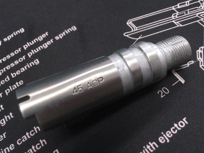 リアルな質感と高い耐久性のカスタムメタルチャンバー。 45ACP刻印のバージョン。45オートシリーズ共用。