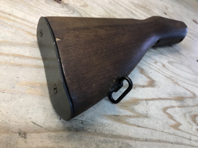 MGC製トンプソンの木製ストック。ワンタッチで簡単に本体に接続でき、固定もしっかりとしている。木製部分はサラッとしたツヤ消し仕上げとなっている。