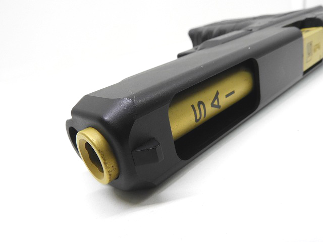 [東京マルイ] グロック34 SALIENT ARMS ゴールデン スティールアウターバレル (中古) 製品詳細画像5 ゴールデンバレルの上部にはSAIの刻印。チャンバーにはSのデザインと9x19刻印。
