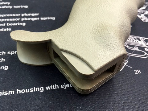ビーバーているも含め全体ラバー仕様で若干のステッピング加工もあり滑りにくい。シンプルなデザイン。DEカラー。ラバー仕様のためやや厚めで重量もある。M4シリーズ等に。