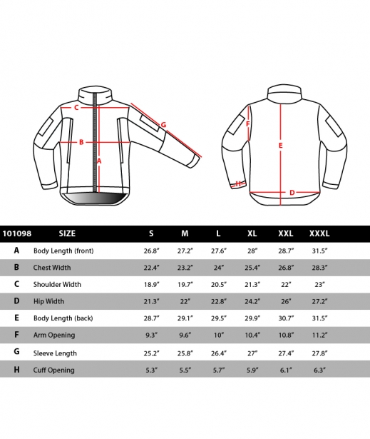 [CONDOR] 101098 Element ソフトシェルジャケット GRAPHITE (新品取寄) 製品詳細画像4 サイズ表(インチ表記)