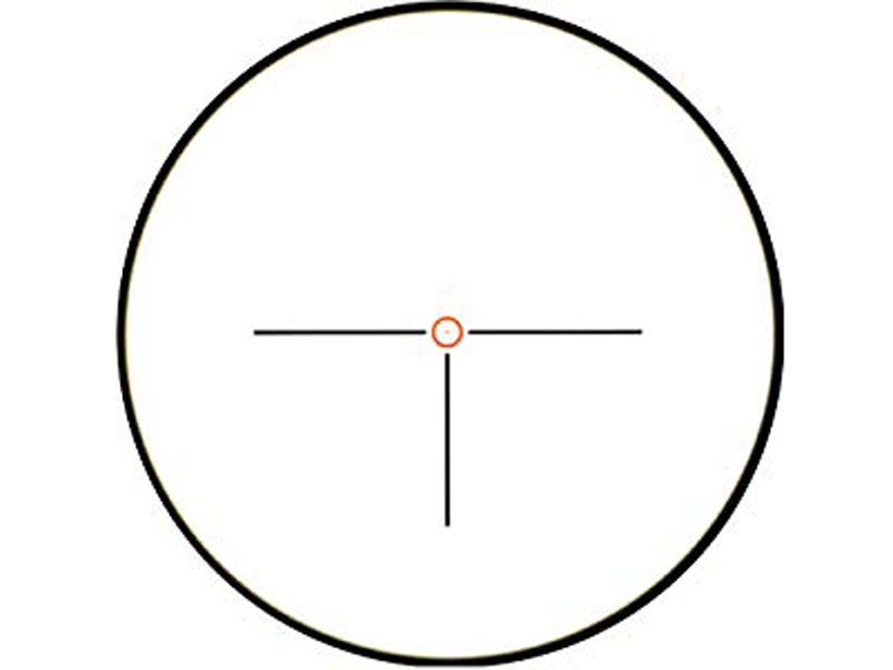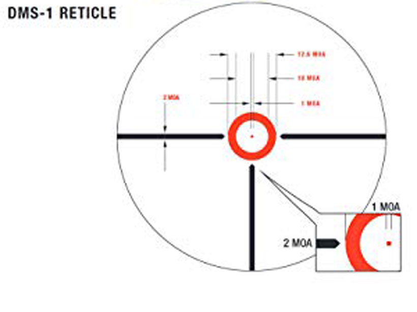 レティクルは Millett 特有の ドーナッツドットレティクル です。 中心のドットが 1MOA を指し、ターゲットが100ヤードにある場合、1インチ(25mm)を指します。 照準まで時間がある精密射撃の場合は 中心のドットを使います。 ドーナッツの内径が 10MOA(250mm)で、速射の場合はドーナッツにターゲットを捉えます。 精密射撃・速射の両方に対応することができるレティクルになっています。