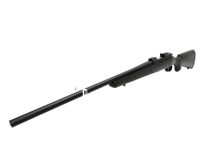 仕様:(全長)1142mm、(重量・スコープ除く)2850g、(口径)6mmBB、(装弾数)22、(付属品)スコープマウントベース、スペアマガジン、(機構)ボルト式エアーコッキング、(ストック)ファイバーグラス入り樹脂製。