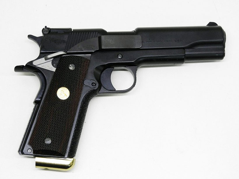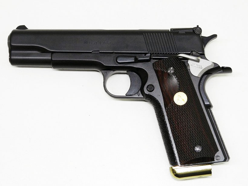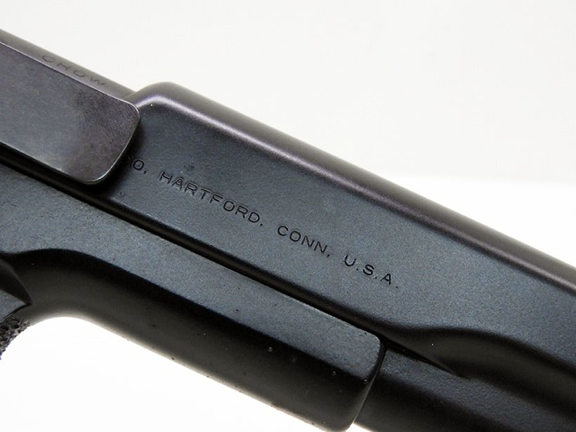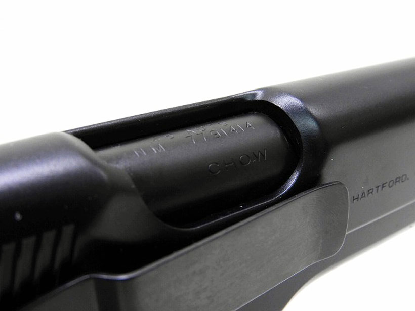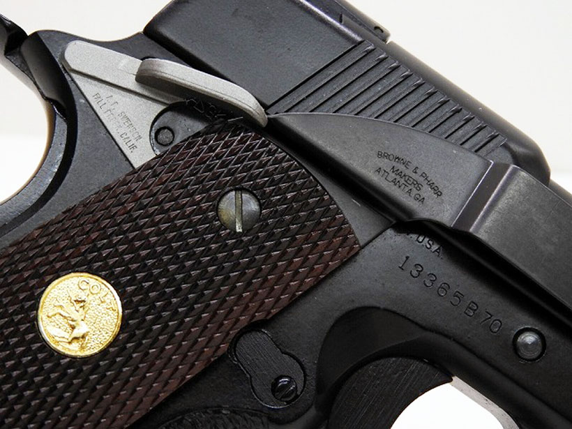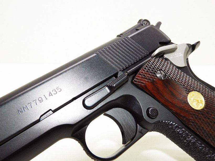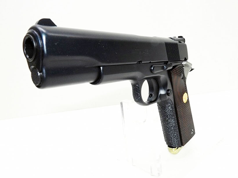 ベースは、シリーズ70のフレームに精度の高いナショナルマッチのスライドとバレル。 調整可能なリアサイト/両側から操作が可能なアンビタイプのセフティ/ズボンや ポケットに引っかけられるベルトクリップ…が取付けられた以外に特別な装備はなく、 とにかく理想の精度・形状に近づけるべくカスタムメイクが行なわれています。 S.C.W.では、専用パーツをふんだんに投入し、フレームに施されたステッピングや 各部パーツのメルトダウン加工をリアルに完全再現しました。