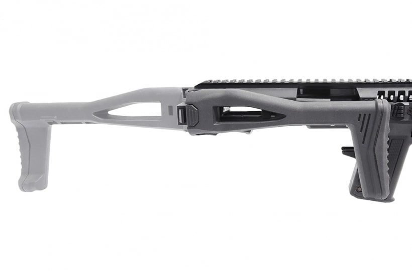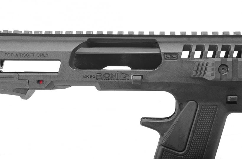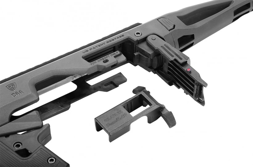 実銃用品メーカーCAAタクティカルのエアソフト部門「CAAairsoft」が送る、エアソフトグレードのMicro Roni。工具不要でグロック17、18C、19、23Fをカービンにコンバートすることができる。