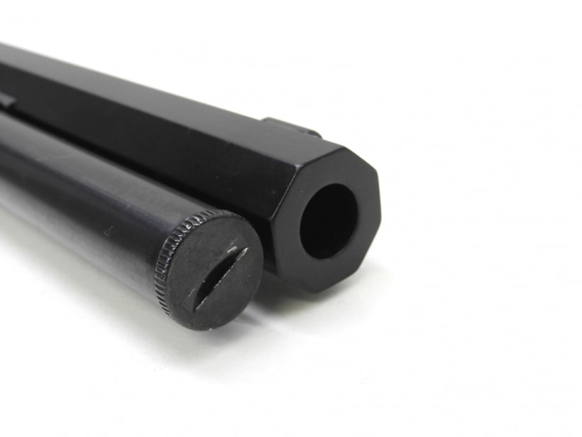 [KTW] ウィンチェスター M1873 ライフル 黒染め仕様 (中古) 製品参考画像3 オクタゴンバレルはアルミの丸棒から削り出しました。バフがけし黒アルマイト処理(メッキ)したあと黒色塗装して仕上げています。