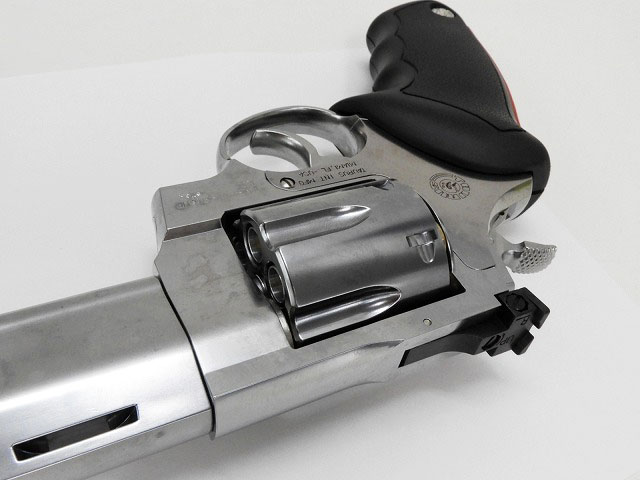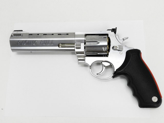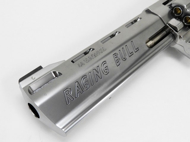 ブラジルのタウルス(英語読みではトーラス)社が開発した大口径リボルバー。  外観としては、放熱冷却用のベンチレーテッドリブと、反動を抑えるフルレングスアンダーラグ、そしてバレル側面に大きく描かれた「RAGING BULL」の文字が特徴的。マズル付近にはコンペンセイターの役割を果たす8つの小さな穴(エクスパンションチャンバー)が設けられている。  マグナム弾の発射に耐え得るようにシリンダーは2点保持されており、ハンマーの後部には、キーの所持者以外は解除できないロックによるセイフティが掛かるなど、機能面、安全面でもしっかりしている。それでいて、値段はリボルバー界の大御所であるS&W社のものとさほど変わらない。  流線型による美しさと破壊力を兼ね備え、大口径主義のアメリカを見据えたこの銃はそれなりに成功し、下請企業だったタウルス社は一躍有名になった。  ちなみに、モデル名は口径、仕上げ(Stainless Silver or Black)、バレル長さ(inch)の順で表されている。