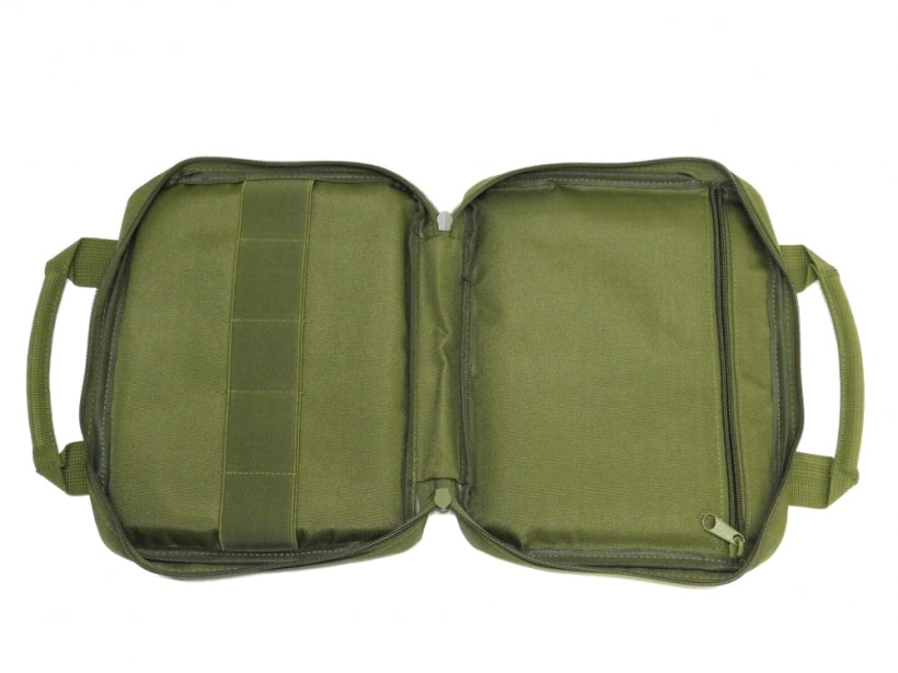 内部のファスナー部を開けていただくと、アクセサリーもしくは中型のハンドガン等を2丁収納していただく時に