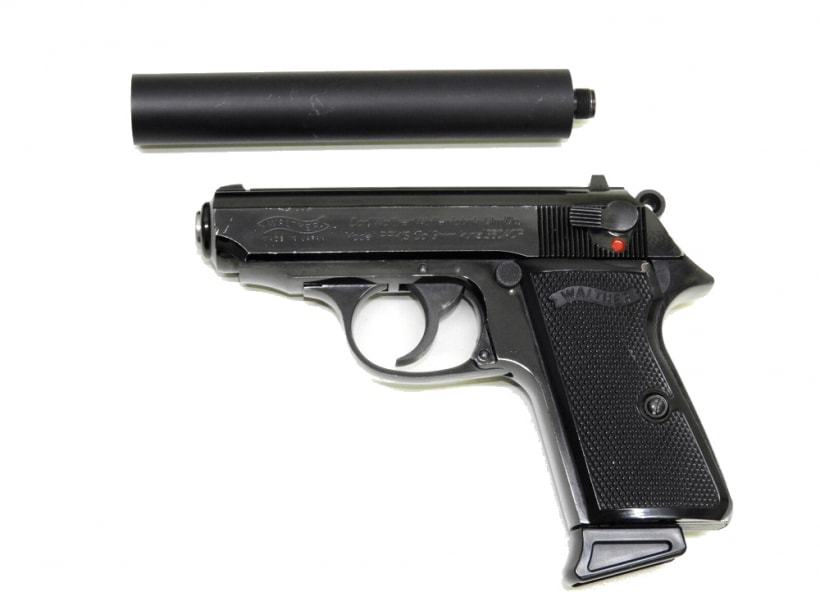 ワルサーPPK/sに金属光沢のコーティングを施したブラックメタリック塗装仕様。サイレンサー/ハードケース付属。