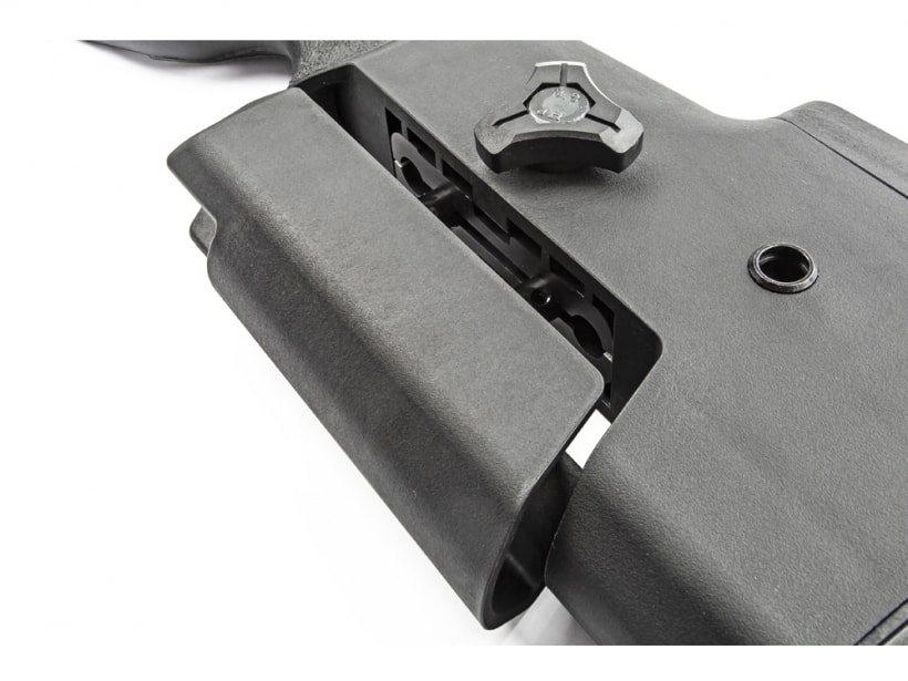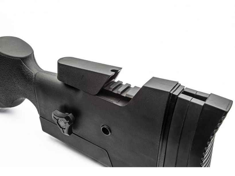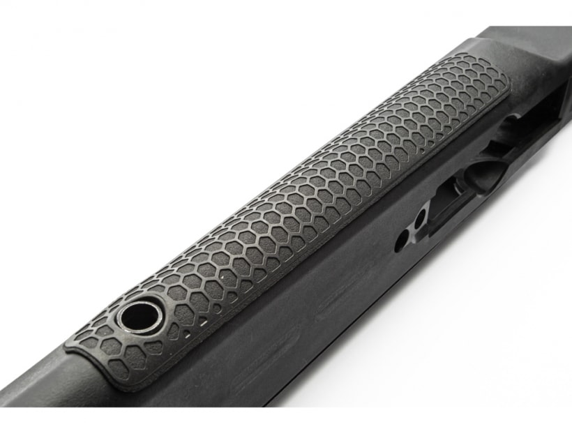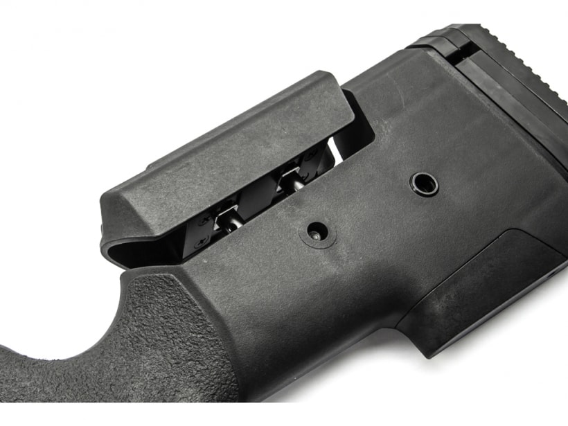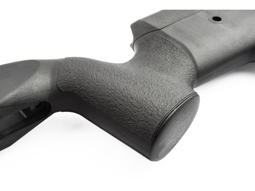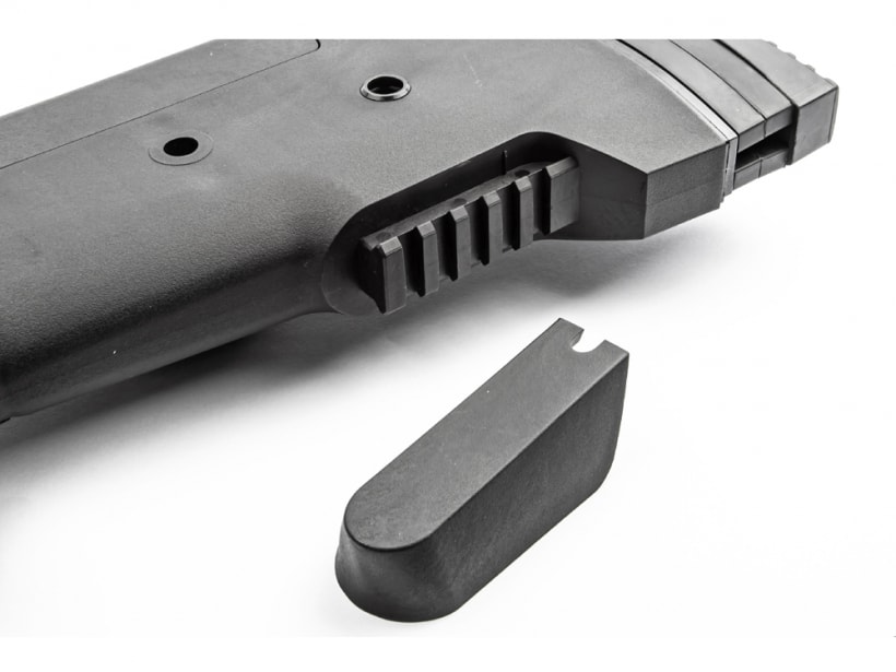 二重に装備したゴム素材のバットプレートが射撃時の衝撃を抑えます。