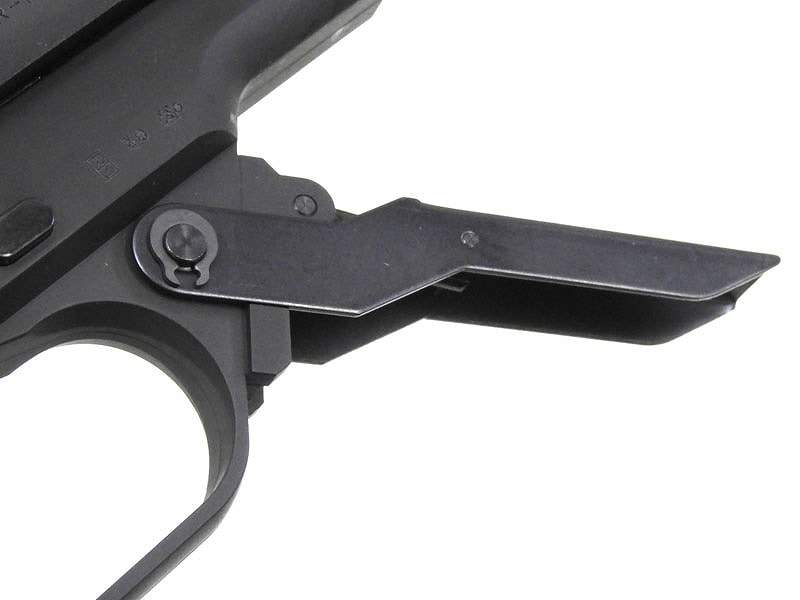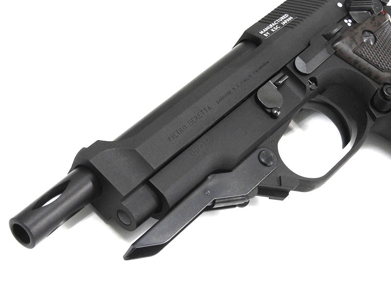 ガスポートが空けられたロングバレル、ロングマガジン、角張ったスライド、大型化されたトリガーガード、反動を制御するフォールディンググリップが個性を主張している。