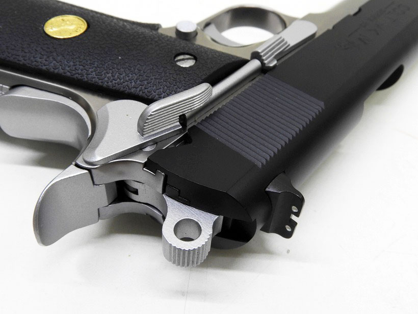 ラウンドタイプのラバーグリップを装着した2トーンボディに、ロングトリガー、リングハンマー、ダックテイル・グリップセフティと3ドットサイトを装備している。