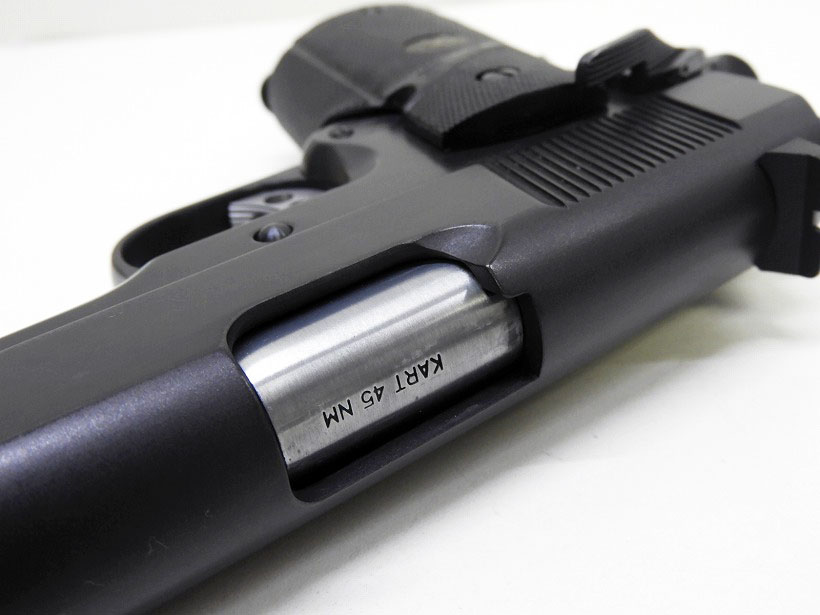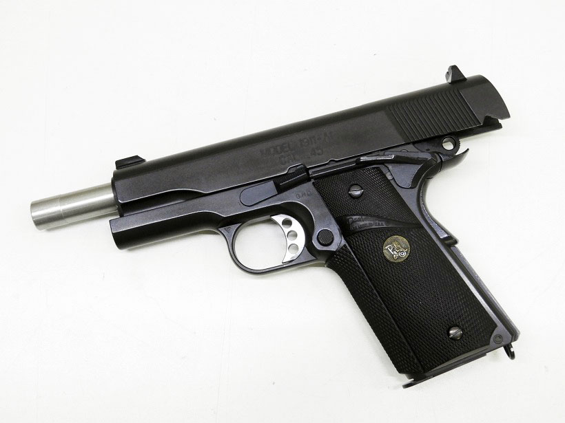 シルバーアウターバレル、KART.45NM刻印メタルチャンバーカバー、パックマイヤーラバーグリップにカスタムされたMEUアーリーモデル。パッケージは別箱(WA製の黒箱)を裏返した物となります。