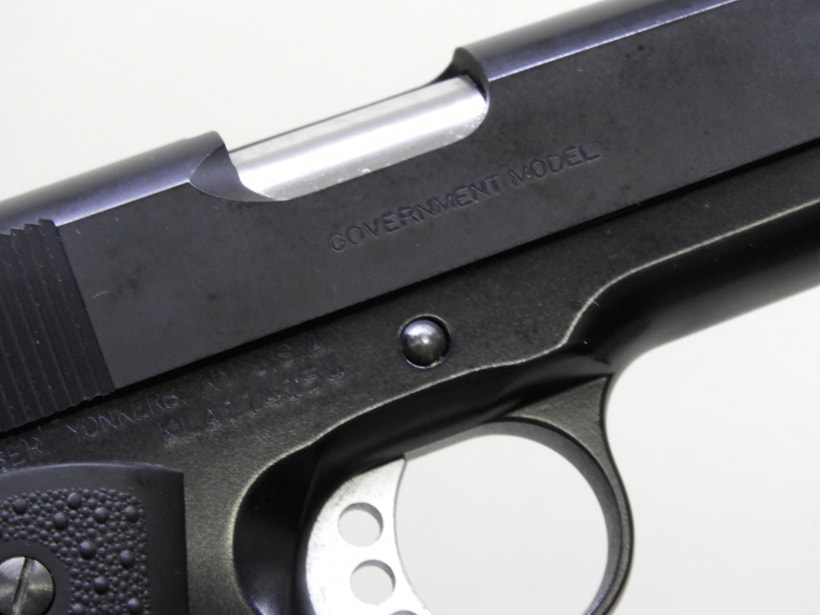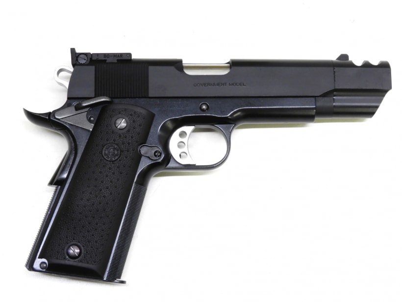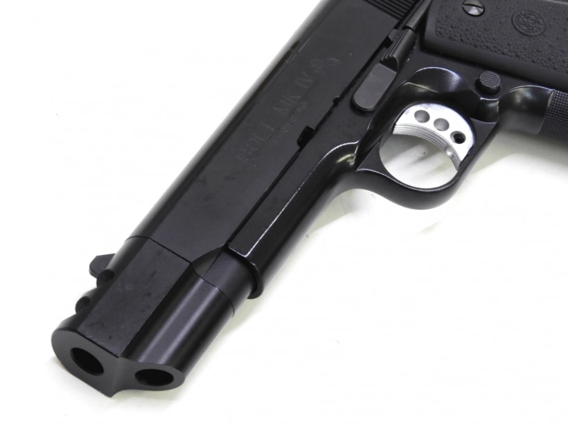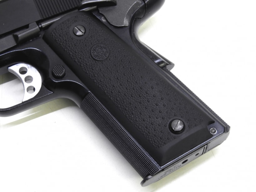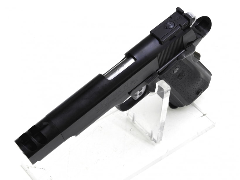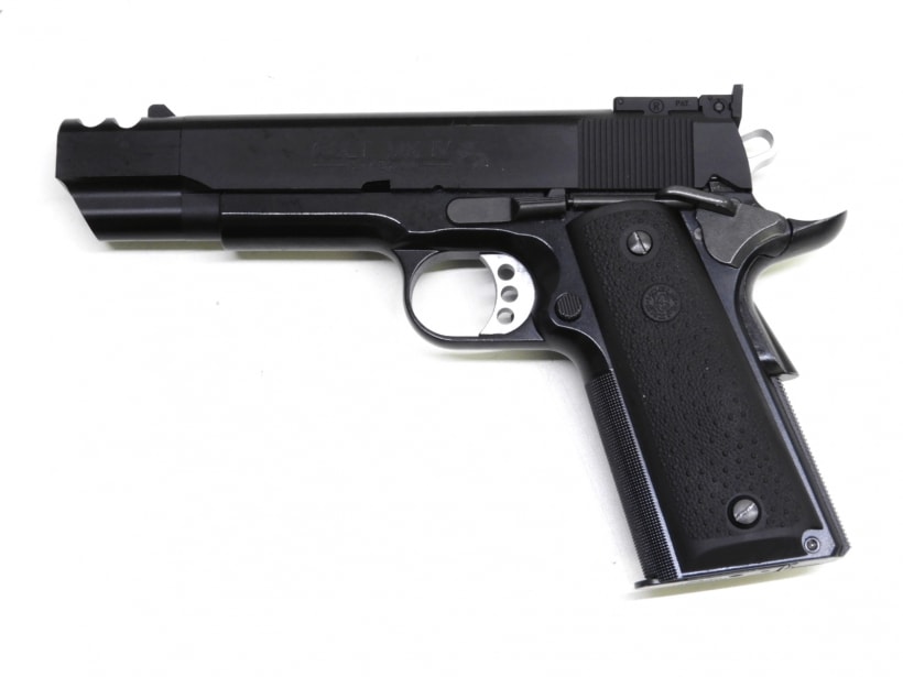 元はシルバーフレームのモデルを黒のフレームに変更し、グリップ、トリガー、ハンマー、スライドストップなど各部もオリジナルから変更されたカスタム品。