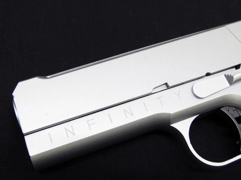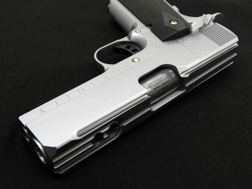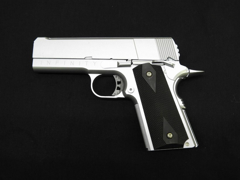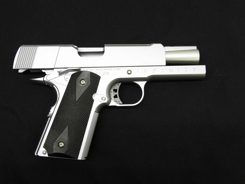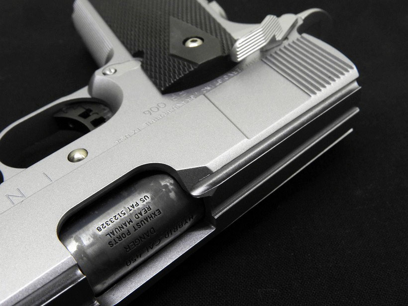 スライドではなくフレームにINFINITYの刻印があるのは、WAのSVIシリーズ中唯一マイアミモデルのみ。これだけでも新鮮味がある。「マイアミ・バイス」のためにSV社が製作したプロップを忠実に再現しており、異形ではあるが.45キャリーガンの究極とも言うべき形状となっている。なおかつド派手にガスポートの空いたハイブリッドバレルを装備、実銃であれば超のつく高性能ガンであろうことは間違いないが、トイガン化されたこちらも玩具に対するとは思えない完成度で仕上げられており、バイスファンならずとも満足できる内容だ。