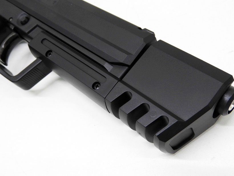 ハンドガンの場合は全体を金属性とする組み換え、エアソフトガンの場合は射出エネルギー0.98J以上にする改造を行うと銃刀法違反となります。HFC134a仕様のガスガンにCO2用マガジンを組み込む、スライドを金属製の物に差し替える等、簡易な改造でも罪に問われる可能性がございますので、絶対にお止めください。