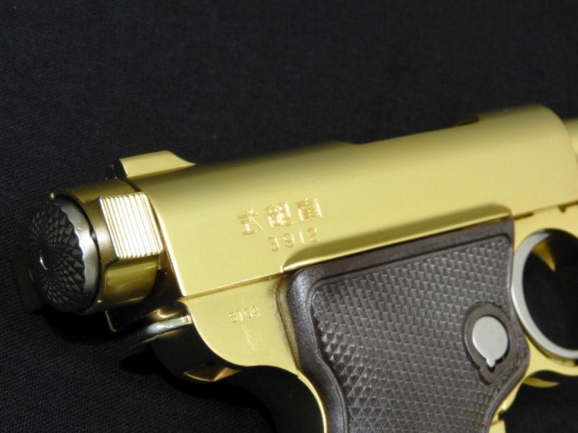 マルシンのモデルガン ヘビーナンブ・ダミーカート仕様。陸軍大学校で成績優秀者に与えられた“恩賜モデル”で「御賜刻印」がされている。全体亜鉛合金素材仕様。カードリッジ8発付属。