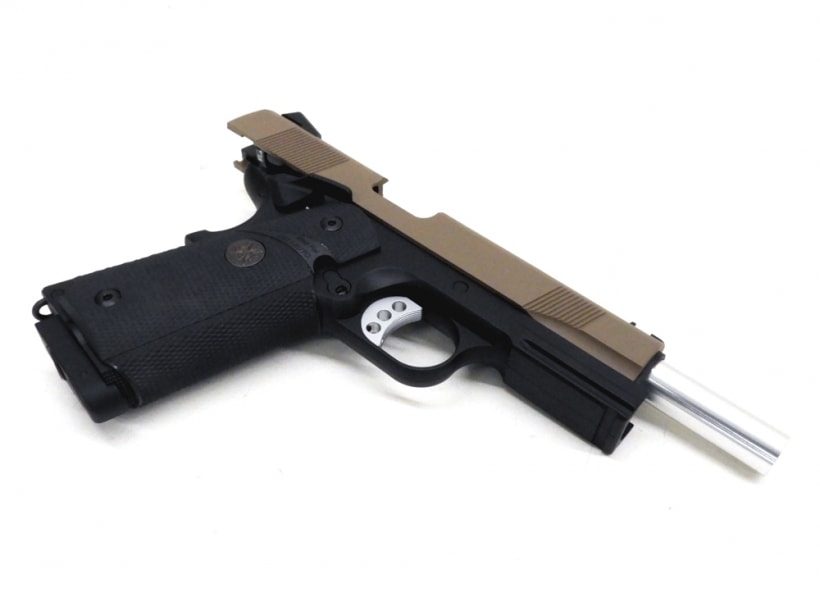 ハンドガンの場合は全体を金属性とする組み換え、エアソフトガンの場合は射出エネルギー0.98J以上にする改造を行うと銃刀法違反となります。HFC134a仕様のガスガンにCO2用マガジンを組み込む、スライドを金属製の物に差し替える等、簡易な改造でも罪に問われる可能性がございますので、絶対にお止めください。