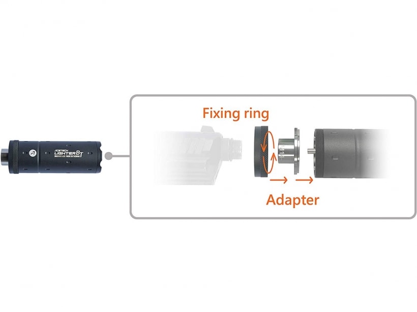 付属のバレルアダプタを使用すれば、WEなどの海外製ハンドガンでバレル内側に11mm正ネジが切ってあるものにも対応します。