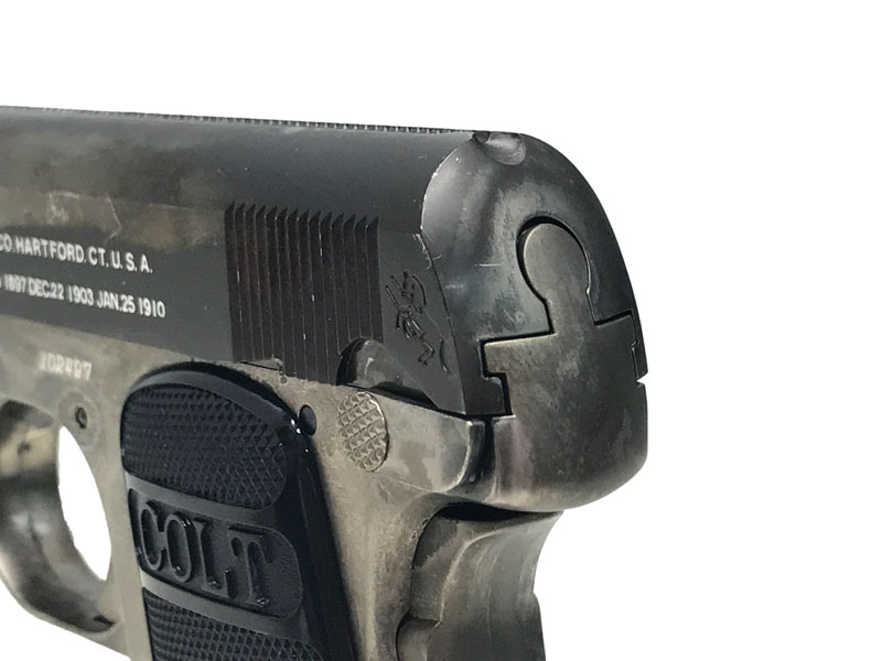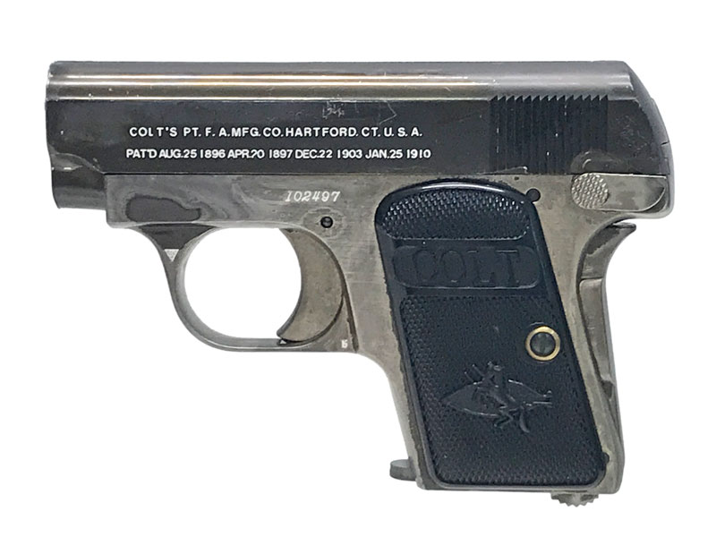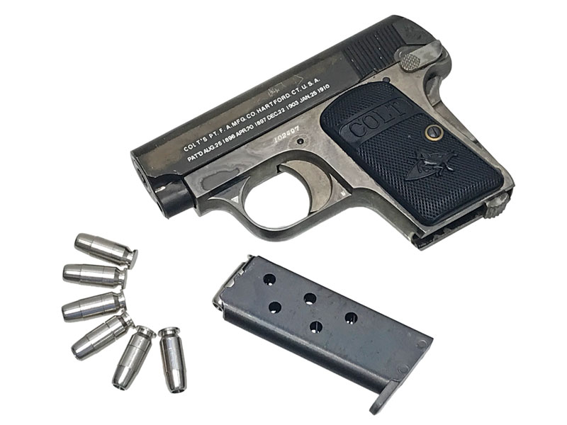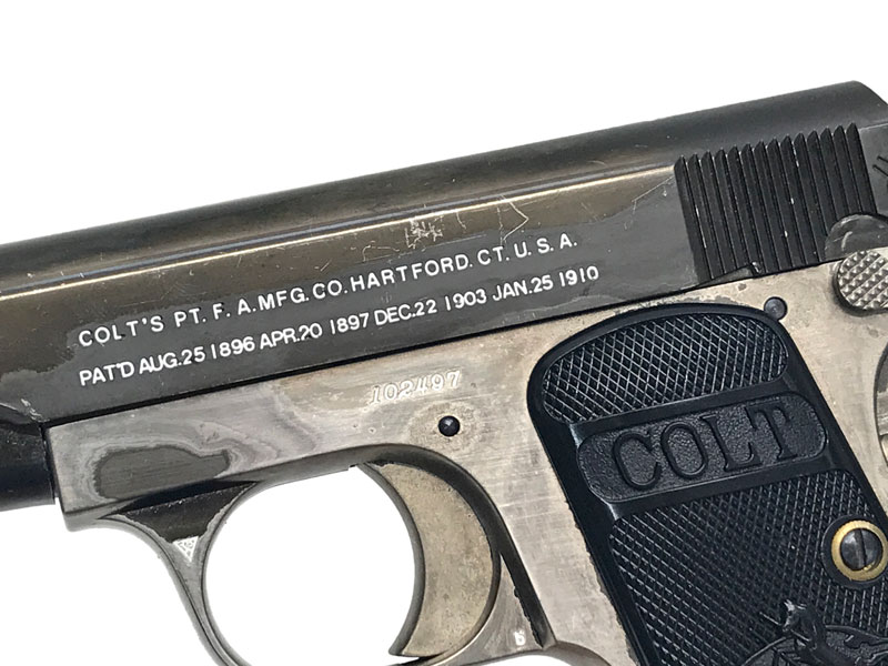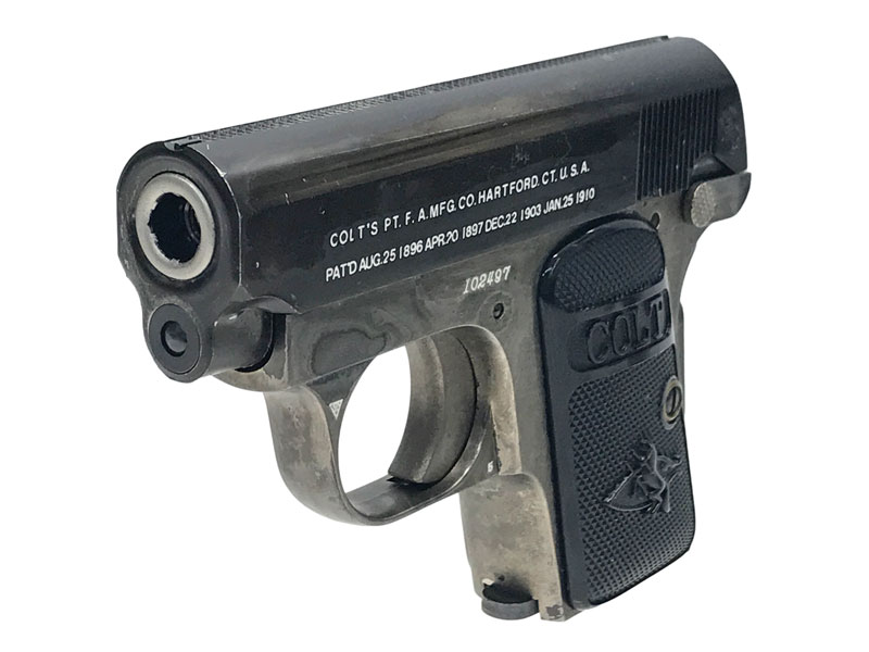 銃器設計者の神様といわれたあのジョン・M・ブローニングの設計で1903年から大量生産されセルフ、ディフェンス用(護身用小型ピストル)として売り出された市場における反響はものすごく、コルト社にあってはM1911A1につぐベストセラー拳銃となった。33年間の生産で実に50万丁にも達した。