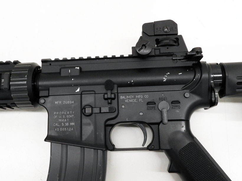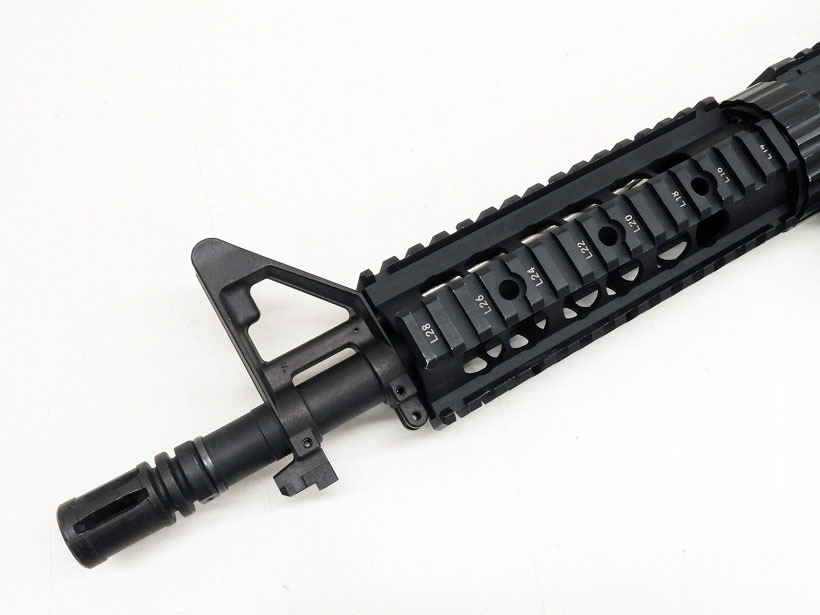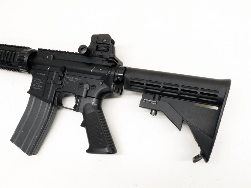 ブッシュマスターストックは6段調整型でチューブにレーザー刻印が入った最新のフィーチャーを再現。アウターバレルは、ハンドガードで隠れる部分まで完全にへヴィーバレル仕様となり、ハンドガードは放熱効果が改良された大口径タイプ。プレス製ヒートシールドと、リアルなガスチューブを内蔵。サイトはフルアジャスタブル式で、フロントポストは超精密スチール切削にて製作。付属のダミーカート型ポンチで、雰囲気たっぷりに微調整ができる。サイト基部に設けられたサイドスリングもM4カービンの特徴(グレネード装着を想定)だが、さらにストック基部にあるプレートもサイドスリング対応型を装備。