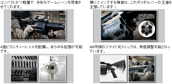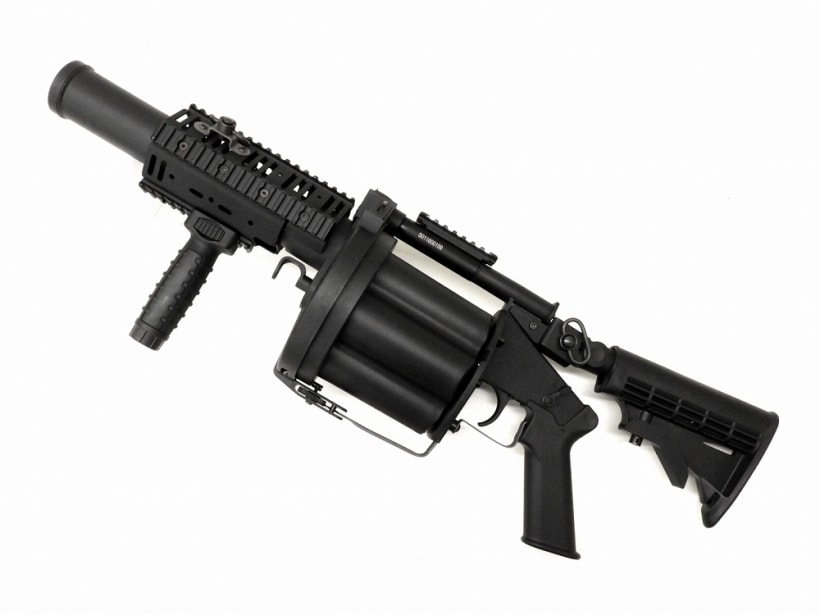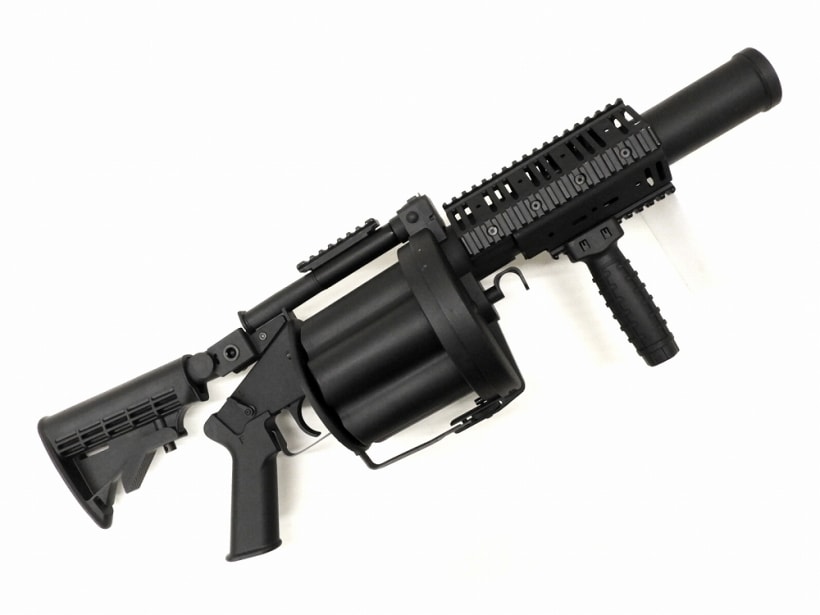 40mm MOSCART が全種類対応したリボルバーランチャー。好みのカートを使用することにより大量のBB弾を連続で放出することができる。台湾メーカーの商品だが、強化樹脂で構成されており、実物と比べ大幅な軽量化を実現しているものの外観のクオリティーは高い。