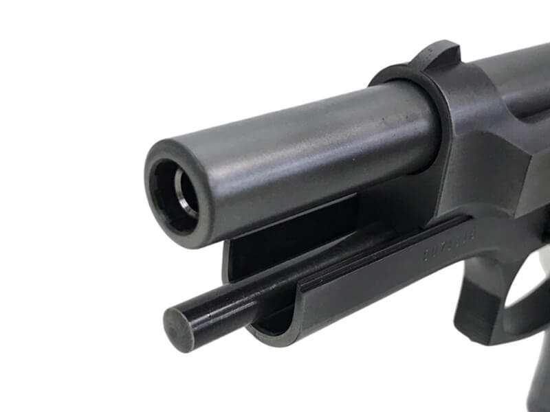 加えて注目頂きたいのは、その1kgを越える重量! スライド/フレームは当然のこと、グリップやアウターバレルに至るまで 高比重ヘビーウエイト樹脂を使用することで、驚くべき重量感を実現。 見て驚き、手にして驚く。トイガンはここまで進化を遂げました。