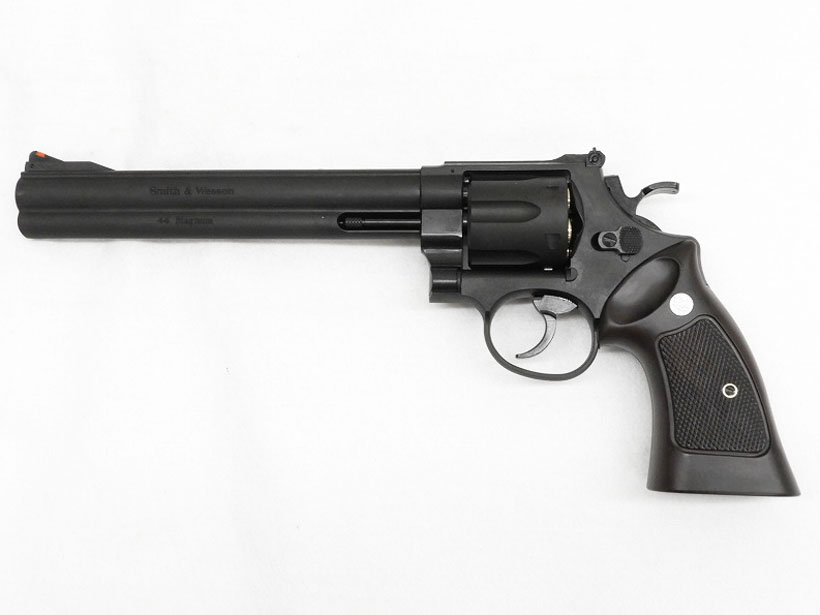 1956年に スミス&ウェッソン社が開発した.44口径の回転式拳銃。狩猟用として開発された.44Magnum弾を、対人用に振り替えたもの。当時史上最大の大口径銃として売り出され、映画「ダーティハリー」においてクリント・イーストウッド演じる主人公ハリー・キャラハンが使用して一躍有名になった。