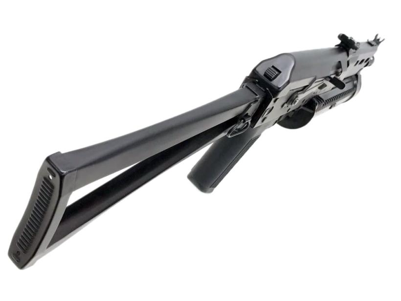 AK-47由来の信頼性の高い機関部に『スパイラル・マガジン』と称するコンパクト&大容量の円筒状の弾倉を、銃身と平行に装着した独特な特徴をもつ短機関銃。