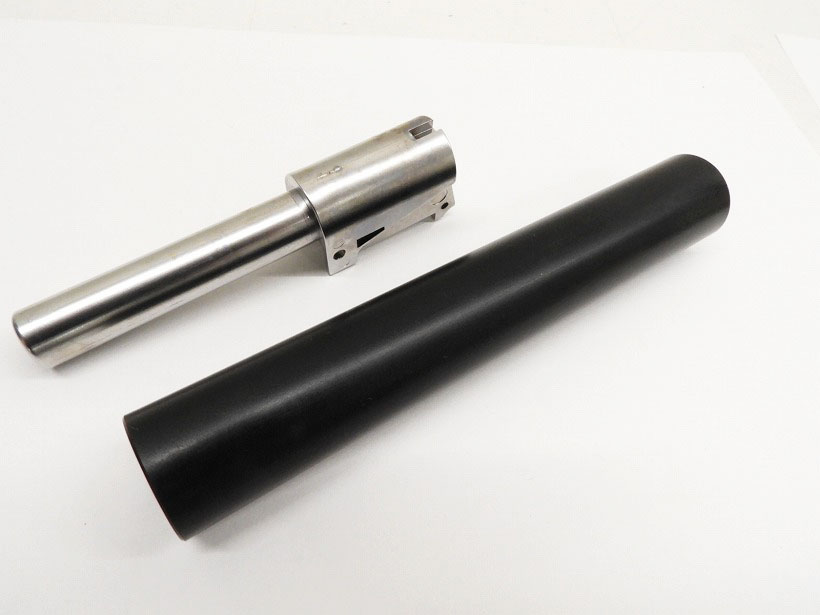 [マルゼン] ワルサー PPK/S ステンレスモデル サイレンサーバレルセット ガス漏れ有 (中古) 製品詳細画像 そのまま装着可能な純正カスタムパーツアルミサイレンサーとノーマルバレルも付属。(カスタムバレルは装着済み)
