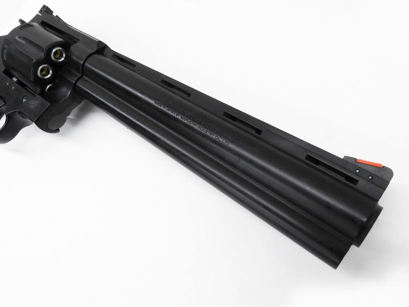 大迫力の8インチバレルは、構えて眺めて楽しいポイント。銃口部、ベンチレーテッドリブ上部はマシン加工により、削り出しの雰囲気を再現するなど、表面仕上げも手が込んだものになっている。 リアルライブなXカートリッジ仕様で一発一発弾をこめる楽しさもある。