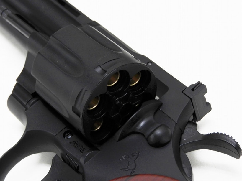 クラウンモデル製 ガスガン。リアルなスイングアクションが可能。カートリッジにBB弾を装填し、シリンダーにカートリッジを装填し発射します。