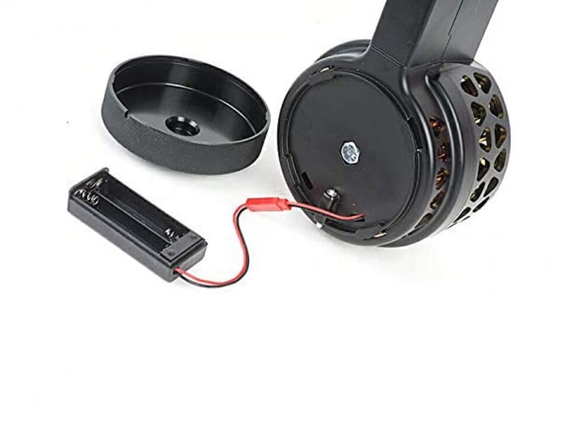 本体の材質はアルミで構成され軽量かつ重厚な質感が演出されています。 カバー下部の銀色のボタンを押しながらカバーを回転させると、バッテリーボックスが現れる造りでバッテリー交換も 容易です。給弾システムは音感式で、電動ガンの発射音を音感センサーで感知して巻上げます。