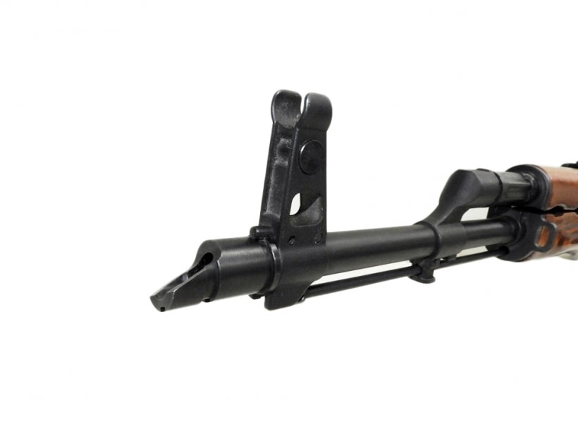 1959年にAK47の後継として配備が始まった突撃銃。AK47と構造はほぼ同一だが、プレス技術の向上により、レシーバー部を削り出しから、初期のAK47でも採用していたプレス製ボディに変更したため、生産効率の向上と軽量化に成功している。またレートリデューサーを装備している為、操作性はAK47よりも良くなっている。その他、ショルダーストックやフォアエンド、ガスポートの形状変更など、細かい変更点は意外に多い。バージョン違いとして1960年にフォールディングストックを装備したAKMSが、1975年に特殊部隊・空挺部隊向けにカービンモデルのAKMSUが開発された。AKMとは、「Avtomat Kalashnikova Modernizirovanniy;Автомат Калашникова Модернизированный(改良型カラシニコフ式突撃銃)」の略であり、マズル先端が斜めに切断されているように見えるのが最大の特徴である。これは発射ガスを上方に吹き上げて銃口の跳ね上がりを抑える、コンペンセイターの役目を果たす。なお小さな変更だが、このAKMから着剣装置が復活している。前作AK47には当初、着剣装置がなく、後にかなり苦労してスパイク状のバヨネット(銃剣)を追加した例が見られた。また、このAKM用のバヨネット(上の写真・右下に写っている物)は、サヤと組み合わせることでワイヤーカッターとして使うことができる。さらにグリップの部分が絶縁されているため、例えば通電された鉄条網などでも安全に切断することが可能。これがなかなかの優れもので、後にアメリカ軍でもほとんどそのままに取り入れられ、制式化された。
