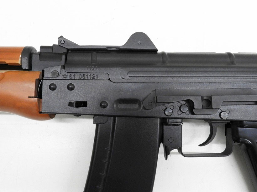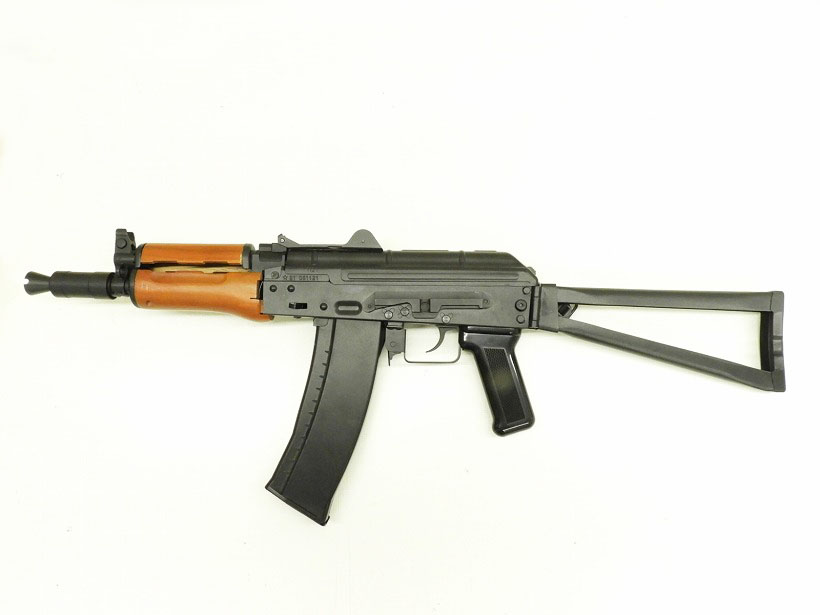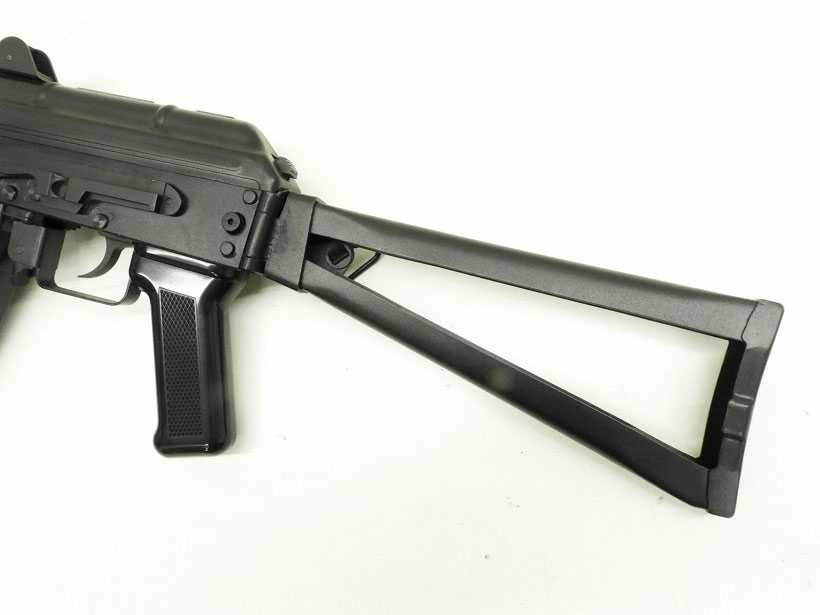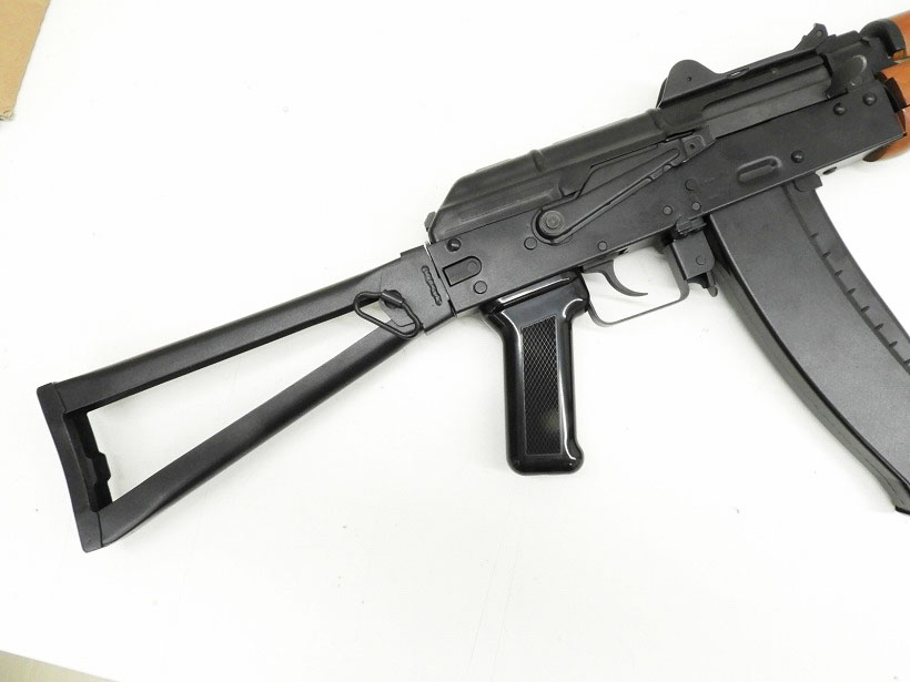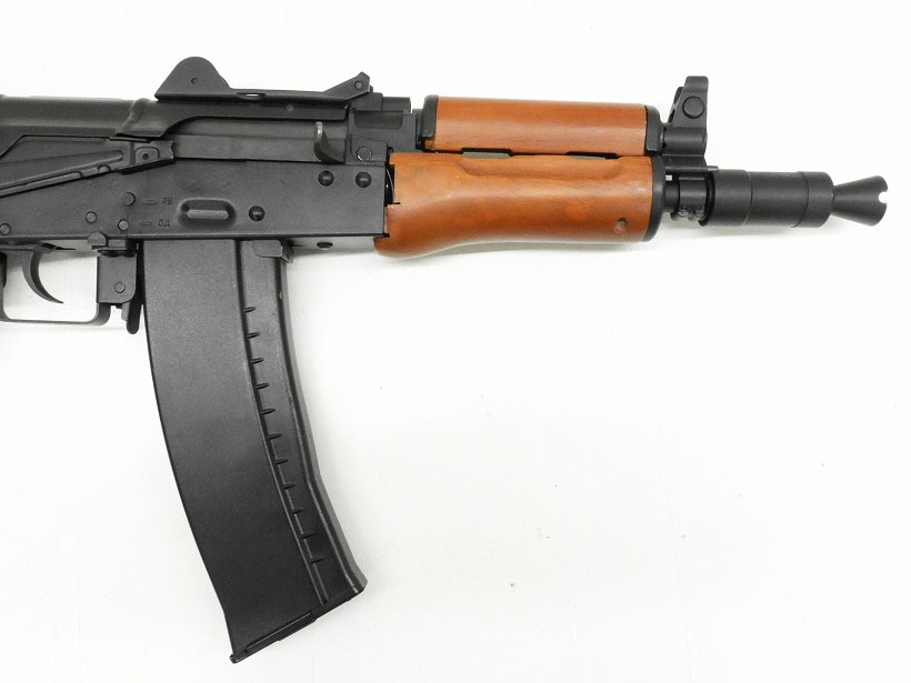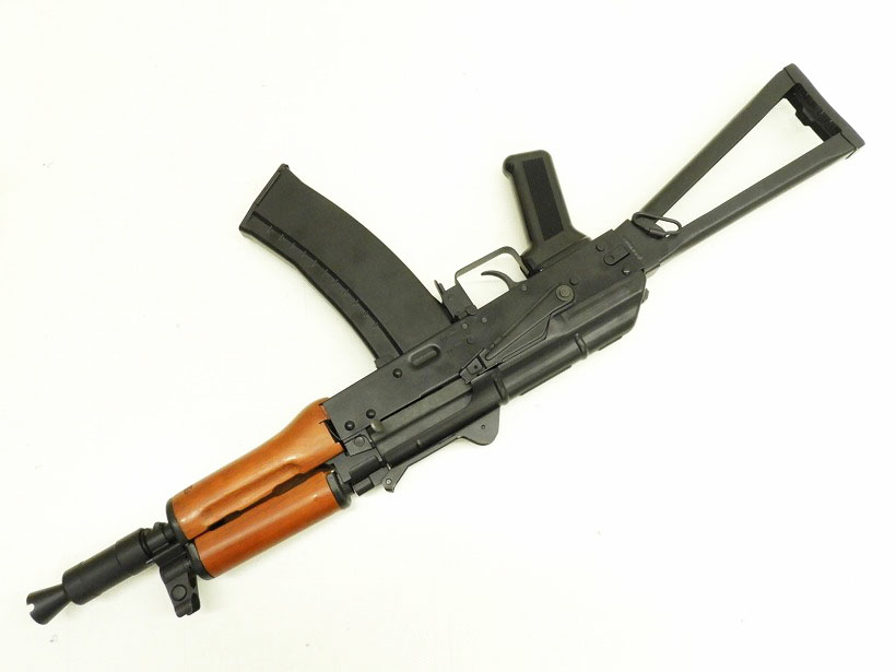 金属製フォールディングストックのAKS74Uを再現。ハンドガードの木製部材の手触り、金属の質感ともに良好で、動作も外観もクオリティの高いモデル。