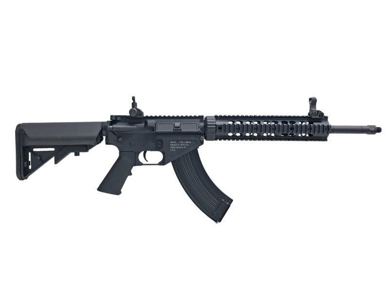 SR-47は、US SOCOMの要請を受けてナイツ社が開発した、AR15ベースの突撃銃。使用弾薬は旧ソ連で開発された7.62mm×39弾であり、AK47の弾倉をそのまま装着できるのが最大の特徴。2001年に開始された『不朽の自由作戦』にて、アフガニスタンに展開した米軍特殊部隊は、補給もままならない敵地奥深くへ進行することとなり、武器弾薬はしばしば現地において拾得もしくは奪取することで賄われた。それらは大半がAKとその弾薬であったため、AKの弾倉をそのまま使用するという着想が得られ、そこからSR-47が開発された。 しかしトライアルを経てみると、現地調達の粗悪な7.62mm×39弾では、機関部の汚れが速く進行する上に、AK用の弾倉を使用するために専用設計とした部品が多く、充分なメンテナンスのためには、予備部品を供給するSR-47専用の補給体制が必須となることが判明した。結局SR-47はわずか7挺のみが製造され、6挺はSOCOMがトライアル用に購入し、残る1挺はナイツ社の博物館に保管されている。