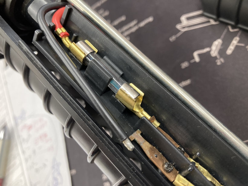 ハンドガード内部のヒューズ部分近くのコネクターが片方外れやすくなっております。 繋げれば動作は可能ですが、初速は50-70m/sとやや不安定です。