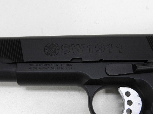 SW1911のスタンダードモデルでスライドにはSW1911のマーキングが彫られている。セレーションなどもバリなどは無く仕上げは丁寧である。