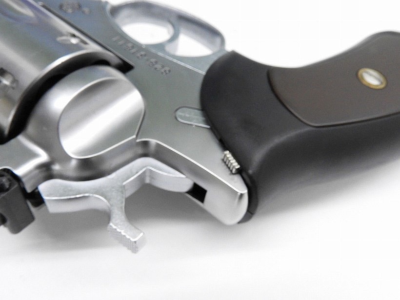 フレームの結合部を筒状に延長したフレームでカバーしたスーパーレッドホーク、44マグナム弾仕様のシルバーモデル。