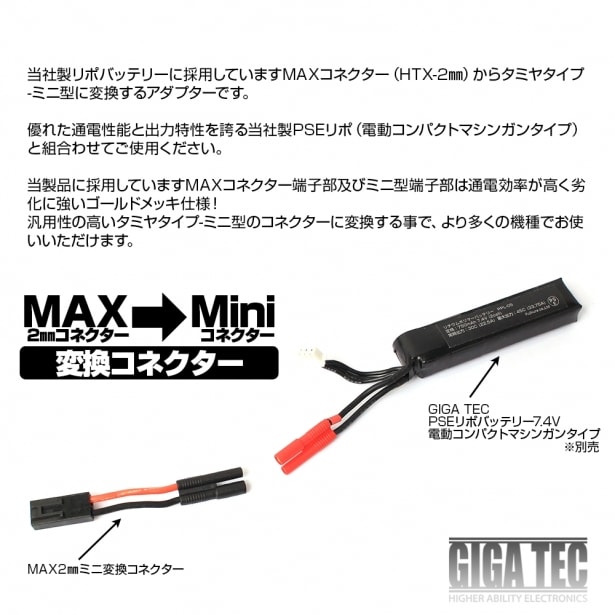 定格電流値が20AのMAXコネクターから、10Aのミニ型コネクターに変換しているため、連続使用(通電)している際に(長時間のフルオート射撃など)発熱する場合がありますのでご了承ください。