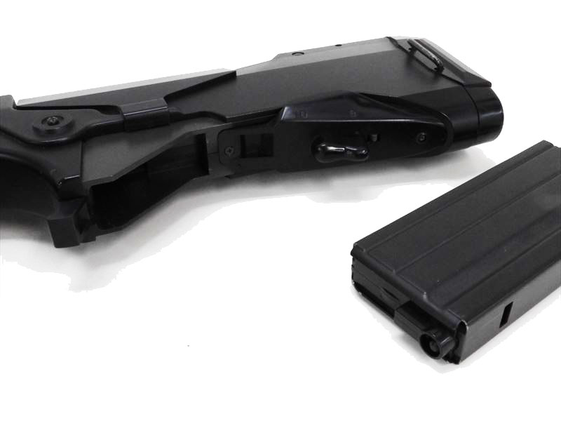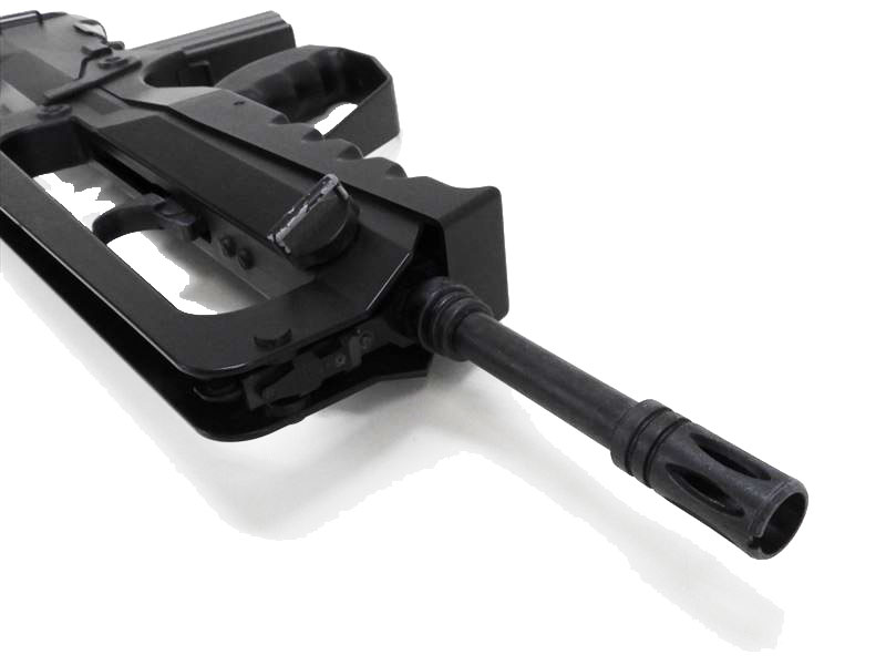 見た目はかなり大きな銃に見えるが全長は757mmとコンパクトなものだ。実銃ではM16のマガジンが共用できるようだが、残念ながらエアガンでは不可である。連射サイクルはギヤ比が高く設定されているのでフルオートの回転は速い。実銃同様ブルパップタイプなのでマガジンの交換などは慣れが必要だが、その分バレルの長さがあるので弾道が非常に安定しているのが特徴だ。