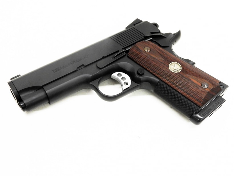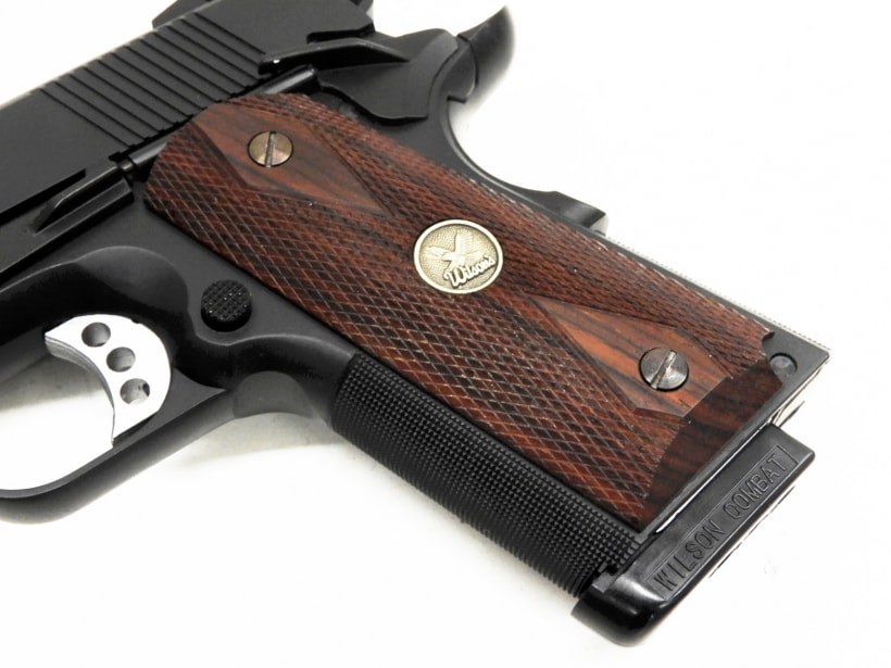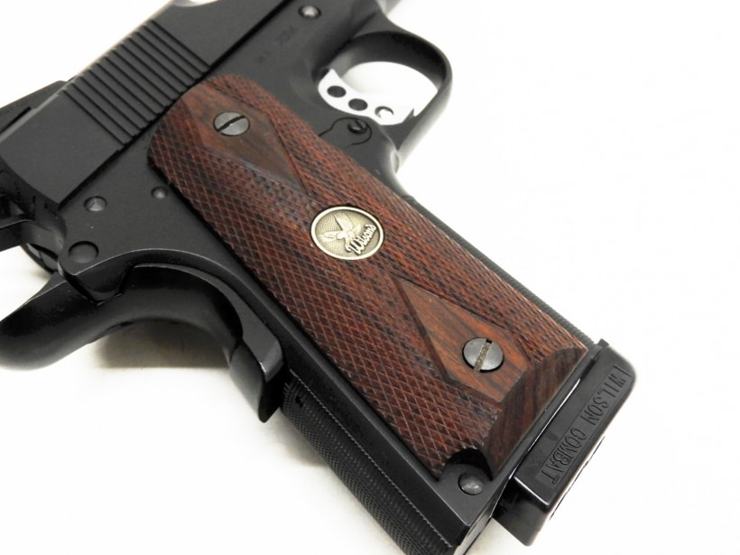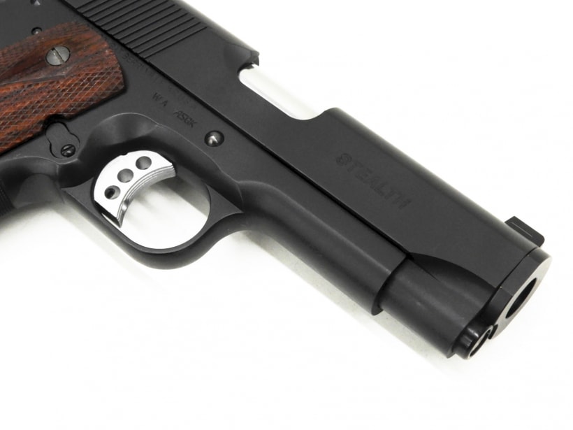 コンパクトサイズはバレルとスライドが短い為にリコイルが強くなり、コントロールし難くなるが、テーパードコーンバレルを採用する事によって銃前方のウエイトが増し、リコイルを軽減出来る。ガスを装填してみると実射性能は良く、ブローバックの回転も小気味が良い。グリップにはウィルソンコンバットのメダリオンが入りスライド右側面には「STEALTH」の刻印が入れられている。