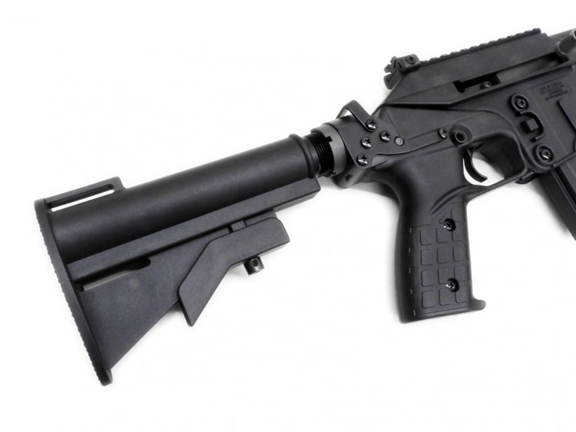ボルトはバレル上のチューブ内を前後動しますので、ストックユニットは取り外すことができ、その状態ではサブマシンガンサイズになります。