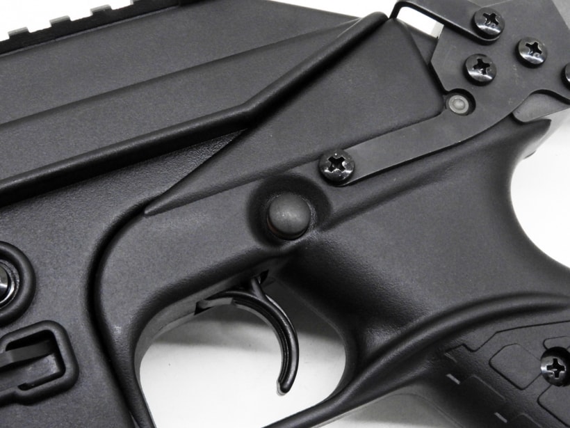 セレクターはトリガー上部のボタンでセミ/フル/セフティを切り替えます。