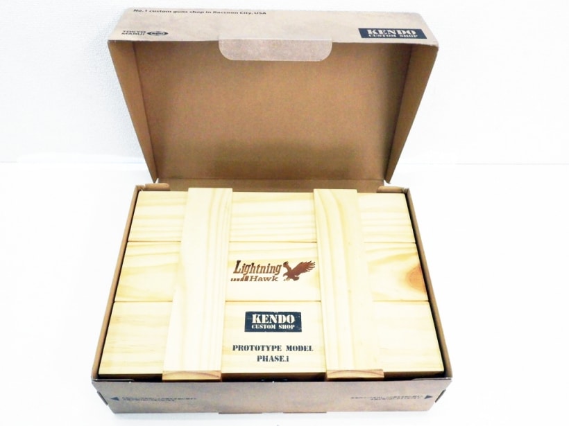 [東京マルイ] バイオハザード2 RE:2 ライトニングホーク デザートイーグル.50AE シルバースライド傷 (中古) 製品詳細画像1 化粧箱を開けると、木箱が登場します。