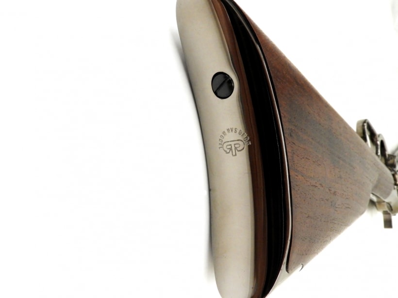 「西部を征服した銃」といわれるウィンチェスターM1873。前モデルM1873カービンのアップグレード版で、金属部分はクロームメッキ、銃床と先台がオイル・フィニッシュの高級ウォールナットとなっている。
