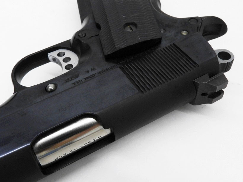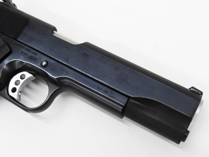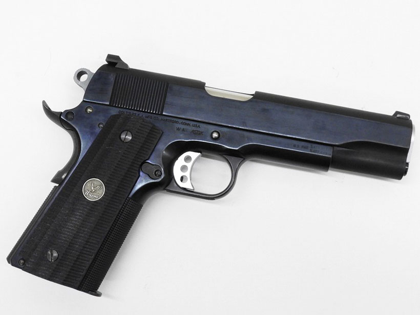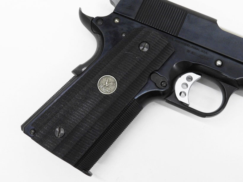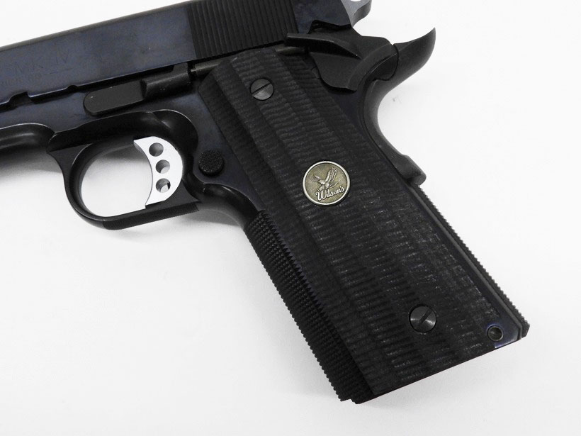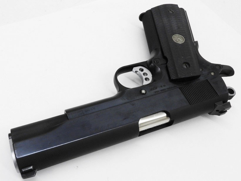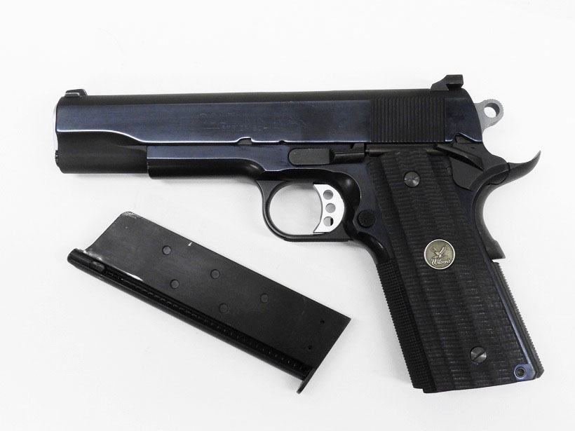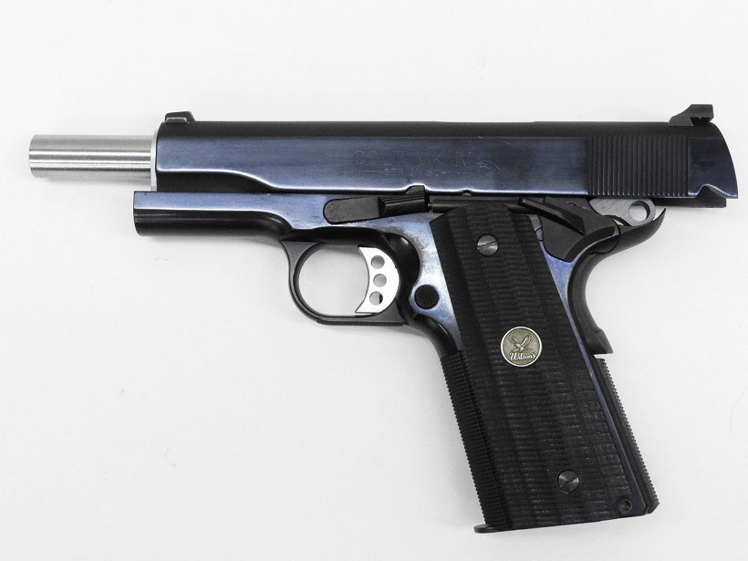 ウィルソン M130 DCPベース、ブルースチール風に研磨、カスタムされたスライドとフレーム。グリップはウィルソンメダリオン入り。