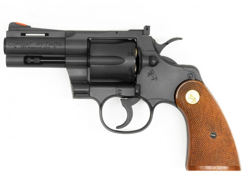 20世紀に入ってリボルバーのメカニズムはほぼ頭打ちになり、市場ではデザイン性による競合が続いていたが、その点においてコルト社はライバルのS&W社に後れを取っていた。そこで老舗の名誉にかけて当時から名銃として誉れ高かったコルト SAAの設計思想を元に、当時最強と言われた.357Magnum弾を発射可能なダブルアクションリボルバーとして、コブラに続くコルト2匹目の蛇として1955年に世に放たれたのがこのコルトパイソンである。  芸術品を思わせる形状ながらも.357Magnum弾の発射に耐え得る剛性を併せ持ち、半世紀経った現在においても「リボルバーのロールスロイス」と呼ばれ人気が高い。仕上げの質の高さも売りで、1挺ずつ熟練工により調整が行われるため、逸材とも言うべき名銃が生まれることもあるらしい。しかし、80年代以降のモデルはコルト社の苦しい財政事業の影響からかその質を落とし、人気も落ちている。  一番の特徴であるバレル上部のベンチレーテッドリブは本来散弾銃に見られ、過熱したバレルが陽炎を発生させて照準を狂わせることを防ぐための物。拳銃でそのような効果は期待できないようだが、パイソンをパイソンたらしめる印となっている。  もう一つの特徴は銃口まで伸びるフルレングスアンダーラグで、これは強力な.357Magnum弾による銃口の跳ね上がりを抑制する効果がある。  仕様としては2.5、4、6、8インチモデルの4種類。特に8インチモデルはパイソンハンターと呼ばれ、1980年代に出た3インチモデルはコンバットパイソンと呼ばれる。ちなみに.38spl弾仕様も極少数生産され警察に納入された記録がある。  1966年に出たダイアモンドバックは一回り小さいフレームを使用した、言わばパイソンの廉価版である。しかしこれといった有用性もなく、1986年には生産中止となっている。パイソンとよく似ているが、表面の仕上げが若干落ちるのと、後ろ側に丸みのある『ラウンドバック』型のグリップで見分けがつく(パイソンのグリップは後ろが角張った『スクエアバック』型)。  なお、ガンショップカスタムで、非常に精度の高いパイソンのバレルと、優れたトリガーフィーリングを持つSW M19のKフレームを取り付けた『スマイソン』と呼ばれるカスタムモデルもある。また、非常に珍しいコルト社公認モデルとして、トルーパーMK-Vのフレームにパイソンのバレルを組み合わせた、限定生産の『ボア(BOA)』、キングコブラのフレームにマグナポートつきのパイソンのバレルを組み合わせた『グリズリー(Grizzly)』がある。