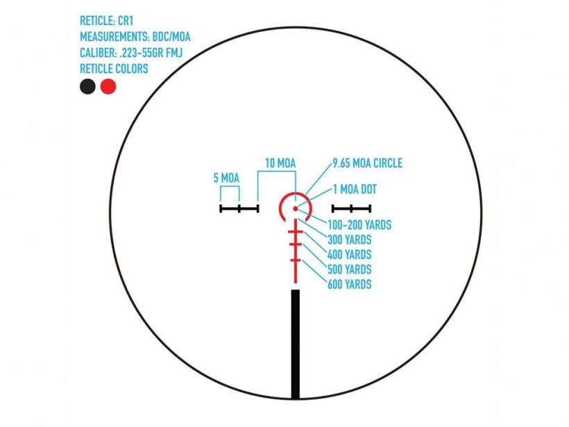 シタデル1-6x24 CR1は、近距離から中距離射撃のための広い倍率範囲を提供し、印象的なパフォーマンスとステルスな外観を兼ね備えています。実際の射手を念頭に置いて設計されたCitadel1-6xは、55gr 5.56 / .223用に調整された2番目の焦点面BDCレチクル、ターゲットとのコントラストのためと低照度での射撃に役立つ赤いレチクル照明、完全にマルチコーティングされたレンズを備えています。キャップ付きの目立たないタレットはゼロを保護します。一体型の30mmチューブと航空機グレードのアルミニウム構造により、Citadelは非常に耐久性があり、IP67防水になっています。ARやボルトアクションライフルなど、さまざまな銃器に最適なCitadel 1-6x24 CR1には、フリップアップレンズキャップ、便利なスローレバー、1つのCR2032バッテリーが含まれています。